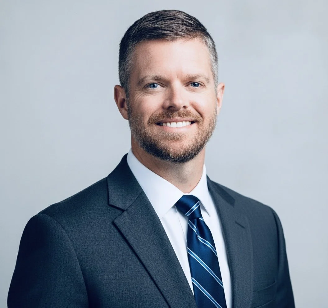 A professional man with short hair, blue eyes, and a beard, wearing a dark suit, white shirt, and striped tie, smiling against a plain light gray background.
